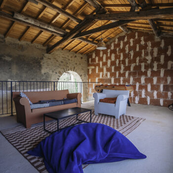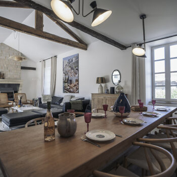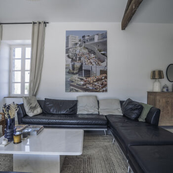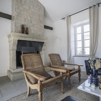 pierre, sol béton, baie vitrée, cheminée, hauteur sous plafond, murs peints / tapisseries