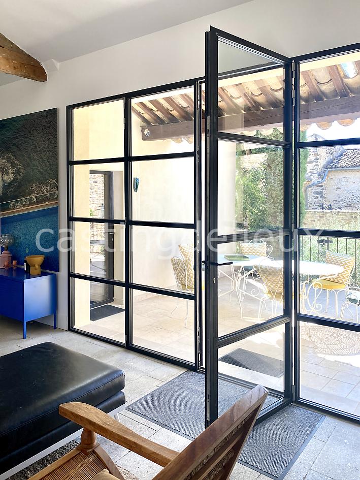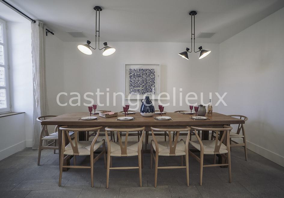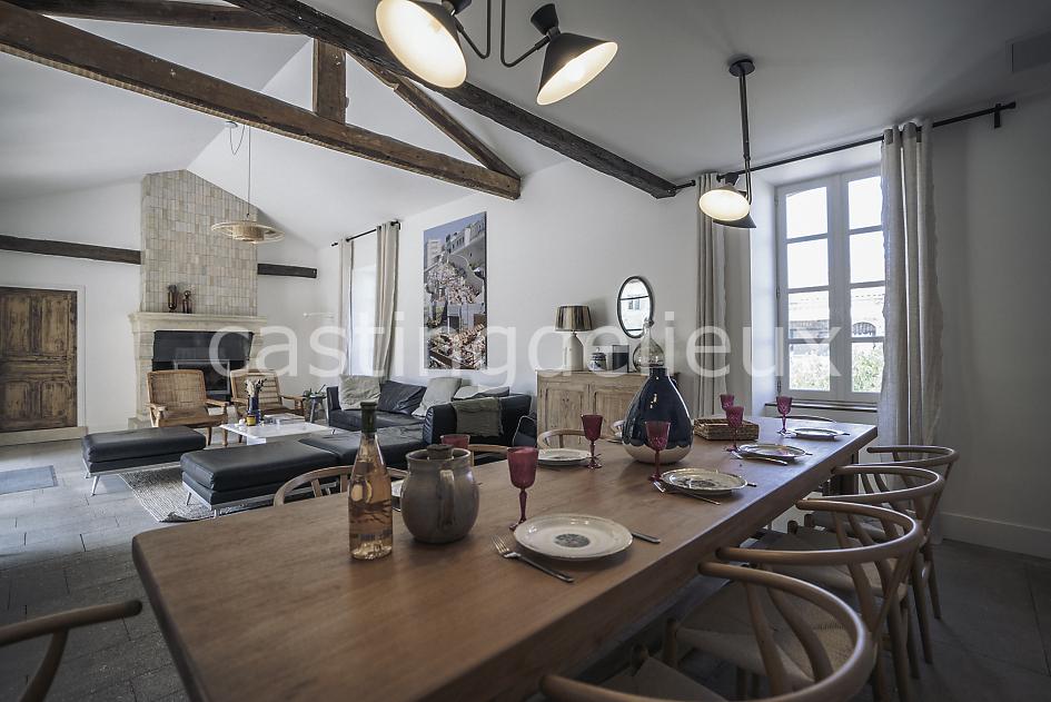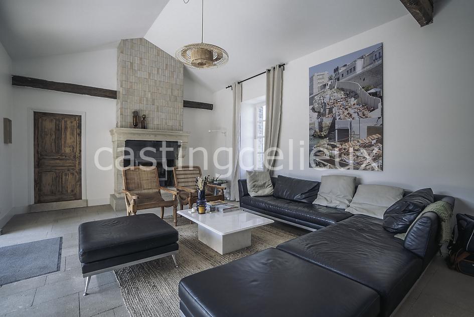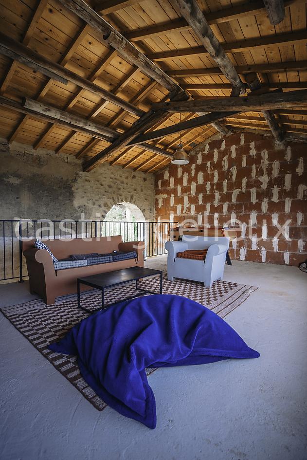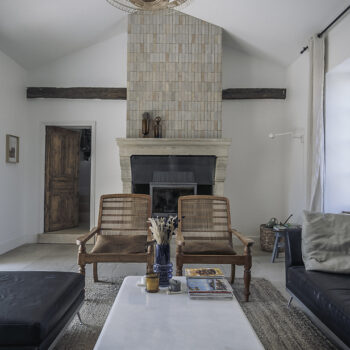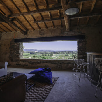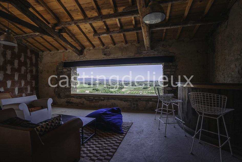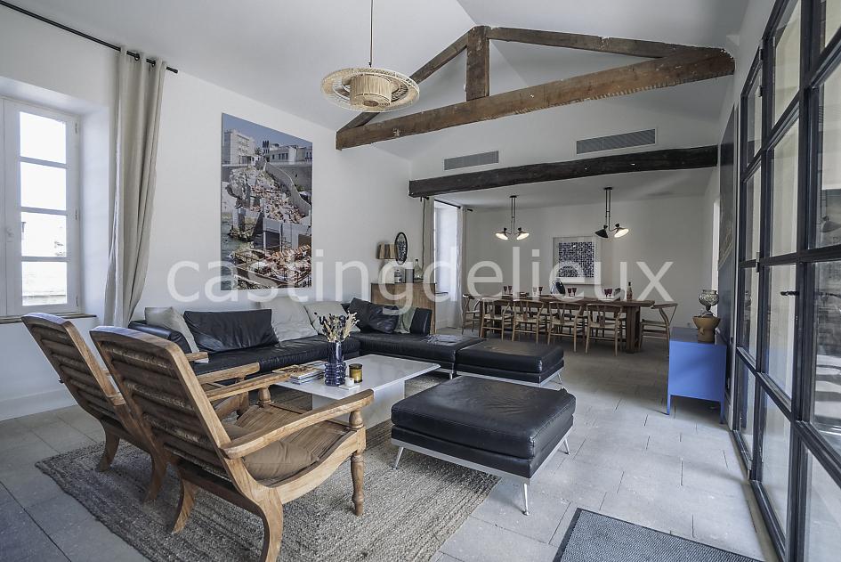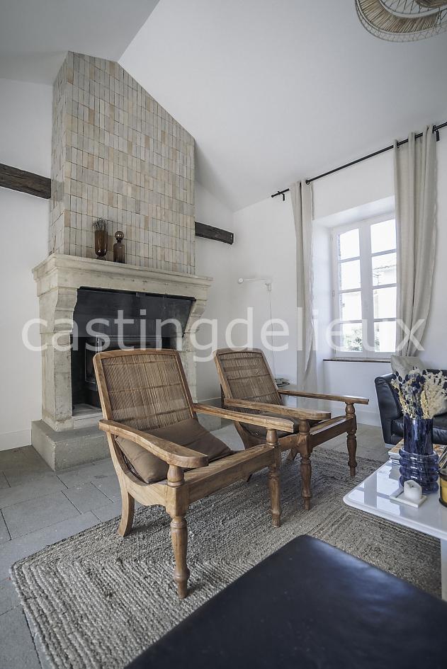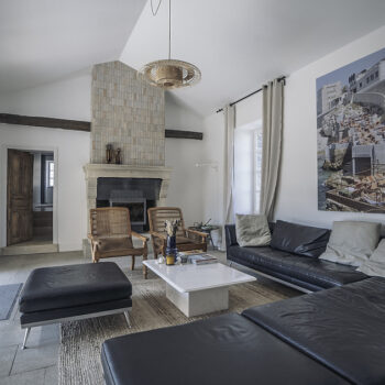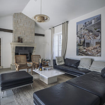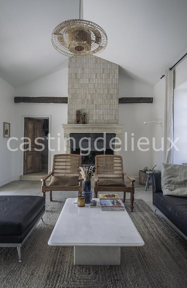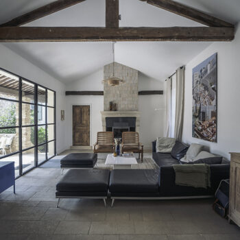 pierre, sol béton, baie vitrée, cheminée, hauteur sous plafond, murs peints / tapisseries