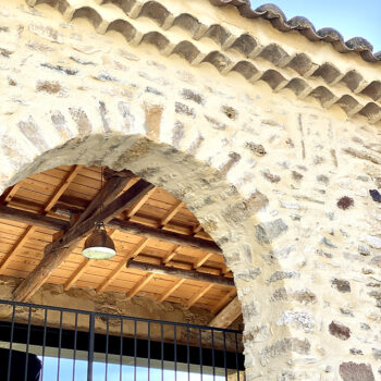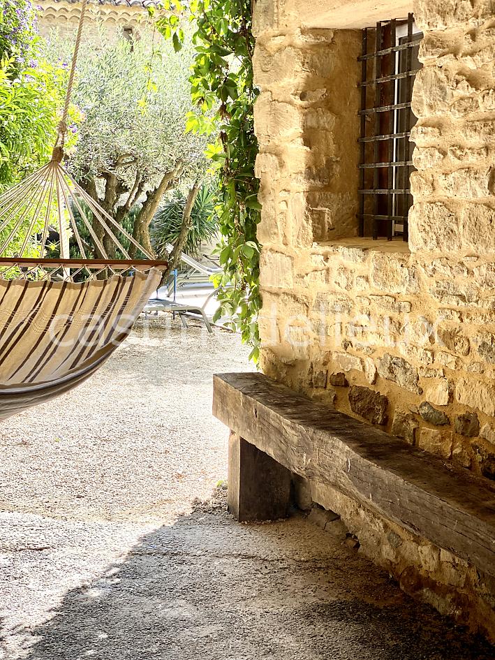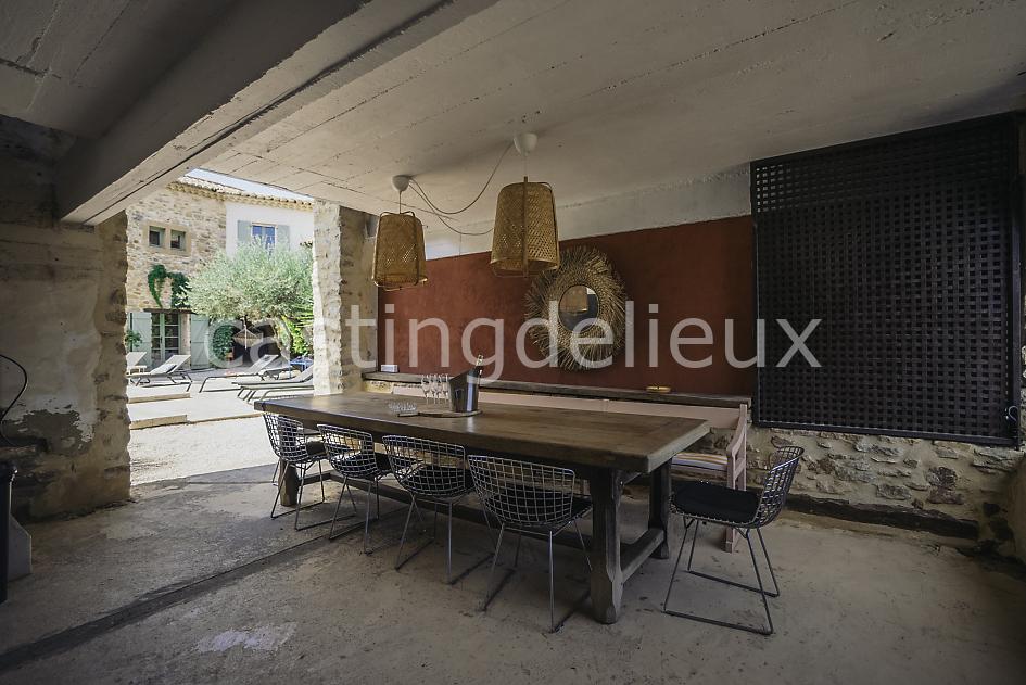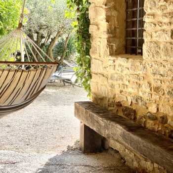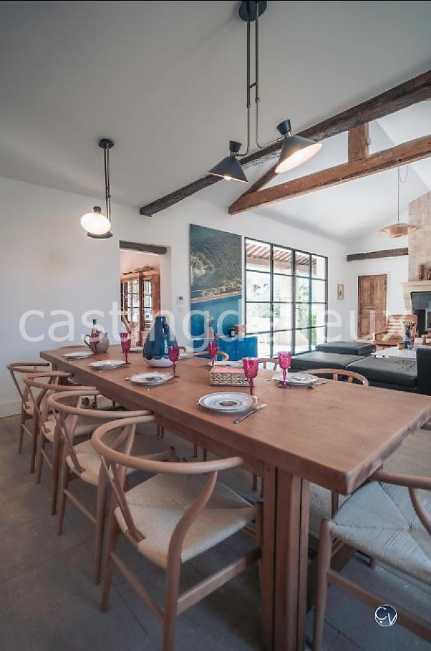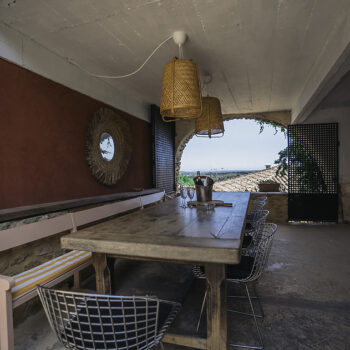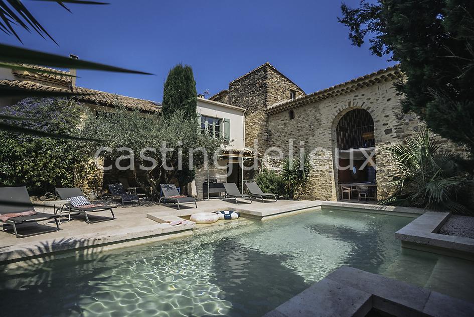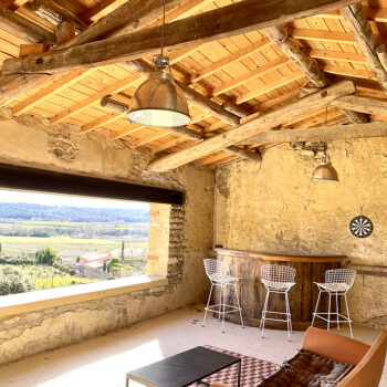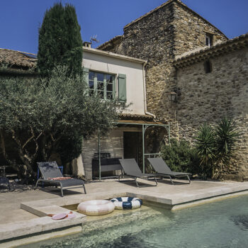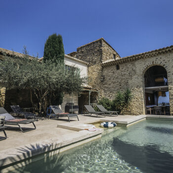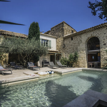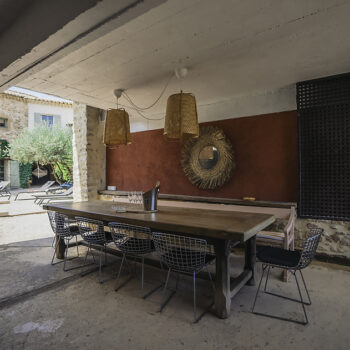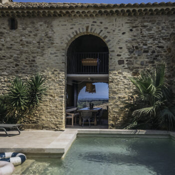 Au cœur de la propriété, la cour intérieure abrite une piscine aux allures de bassin provençal, bordée d’une végétation méditerranéenne. Une cuisine d’été, aménagée sous la grande arche.