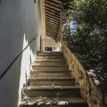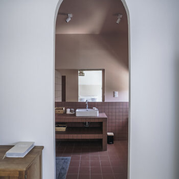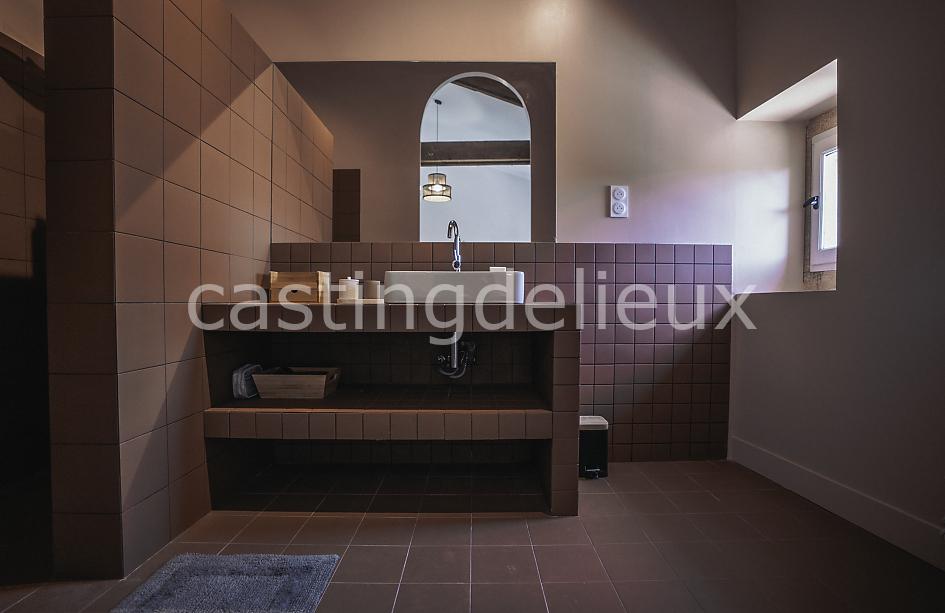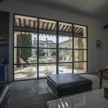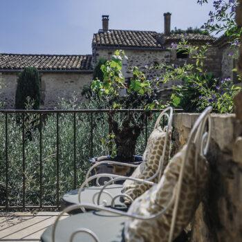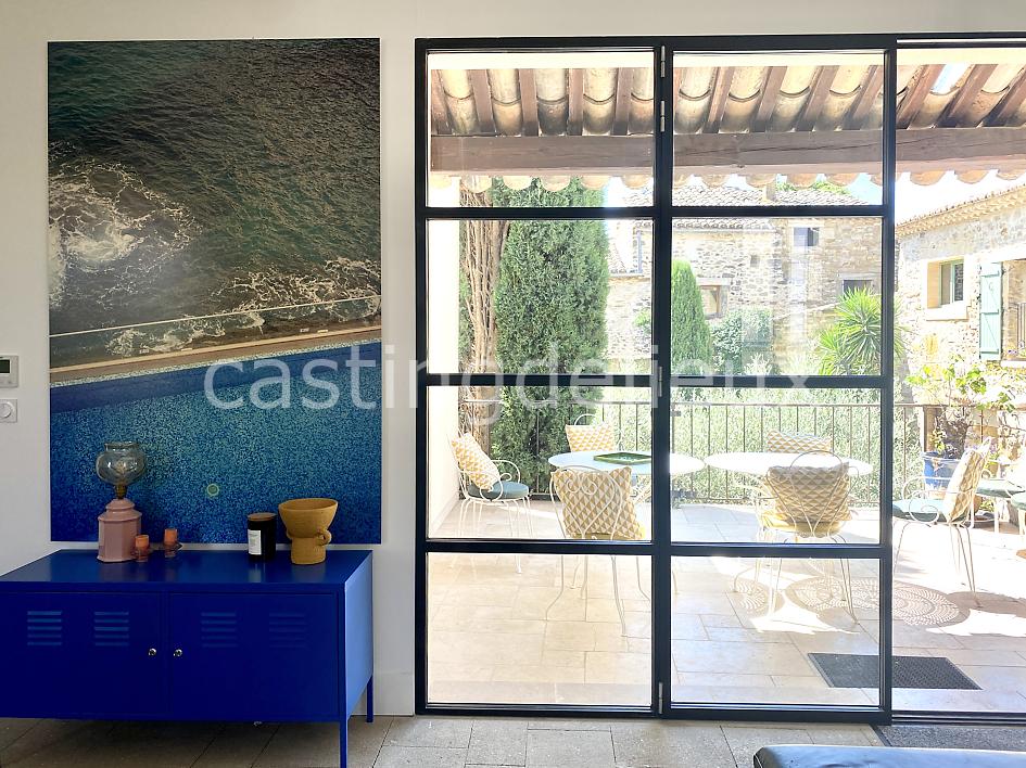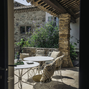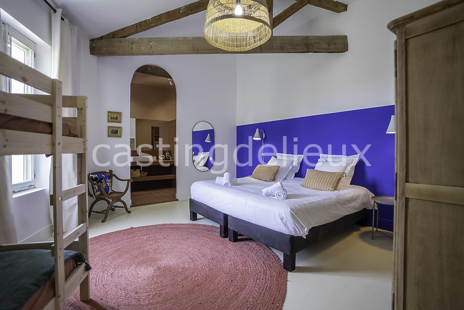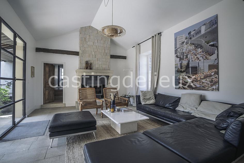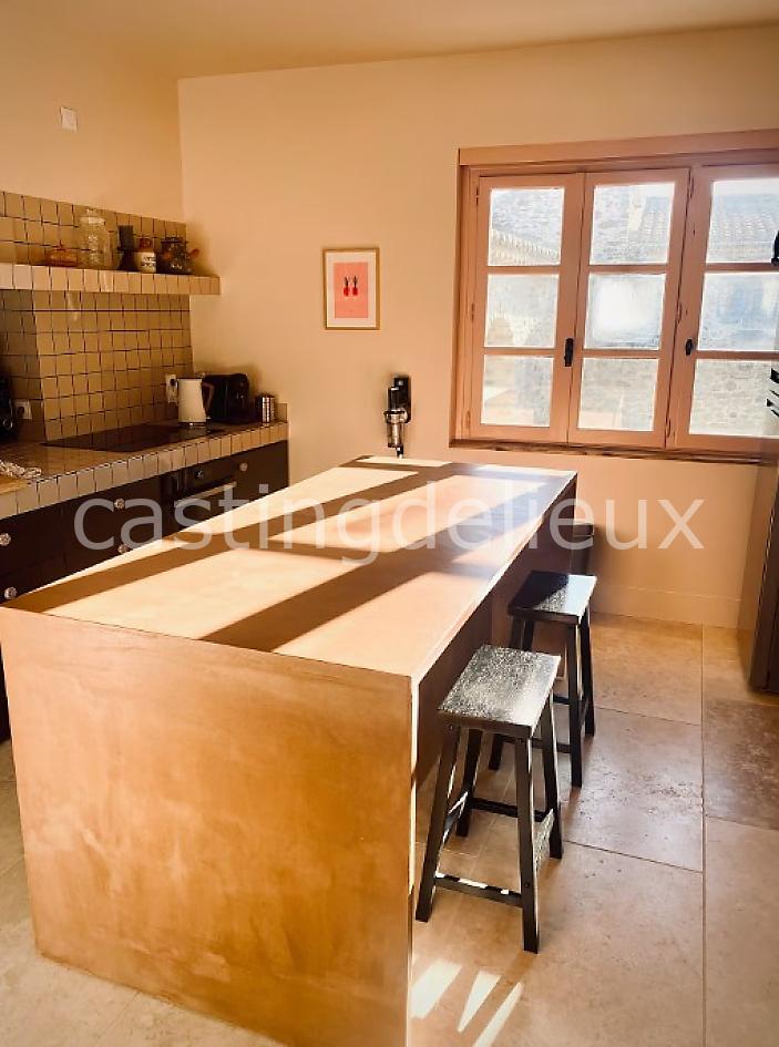 Au cœur de la propriété, la cour intérieure abrite une piscine aux allures de bassin provençal, bordée d’une végétation méditerranéenne. Une cuisine d’été, aménagée sous la grande arche.