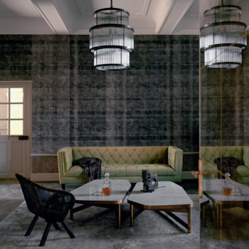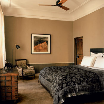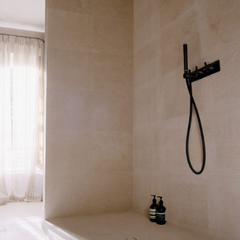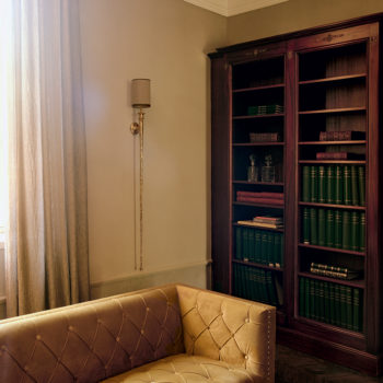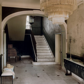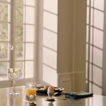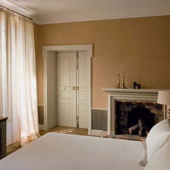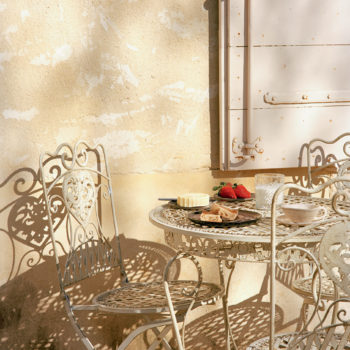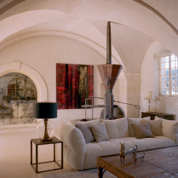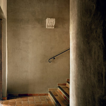 verrière / patio, cheminée, hauteur sous plafond, carrelage/tomettes, murs peints / tapisseries
