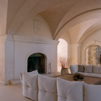verrière / patio, cheminée, hauteur sous plafond, carrelage/tomettes, murs peints / tapisseries