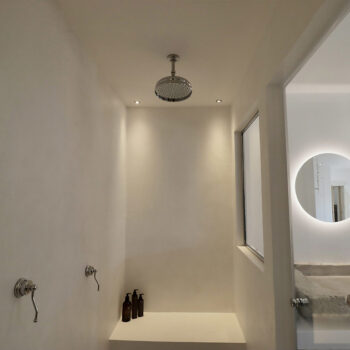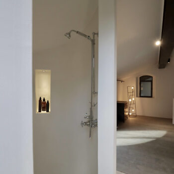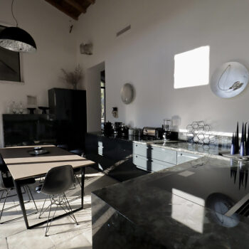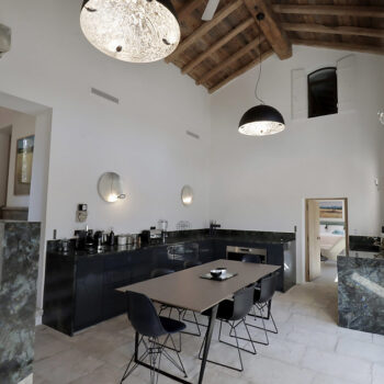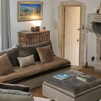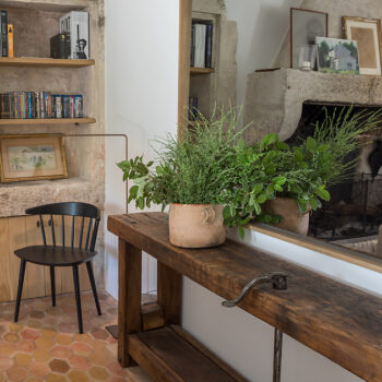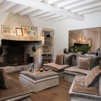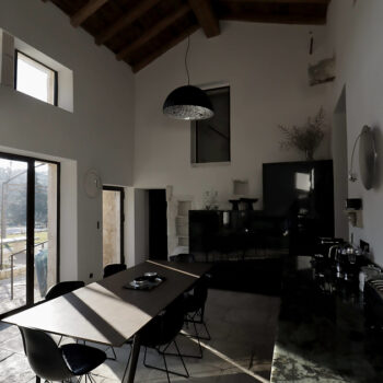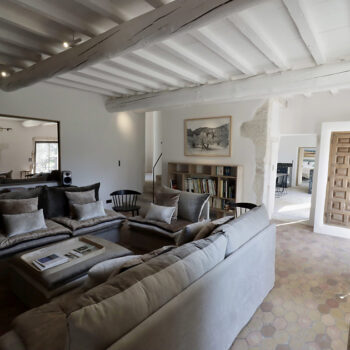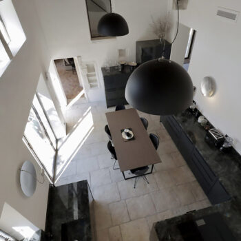 pierre, sol béton, baie vitrée, cheminée, hauteur sous plafond, carrelage/tomettes, parquet, murs peints / tapisseries