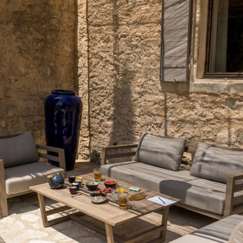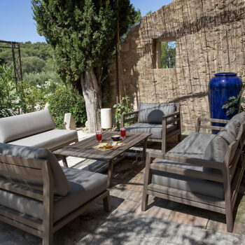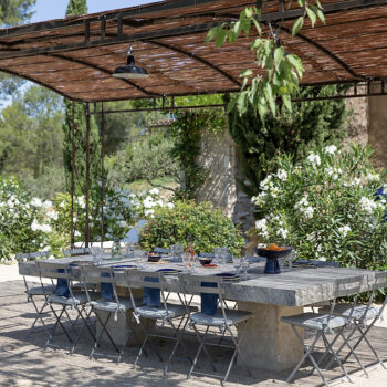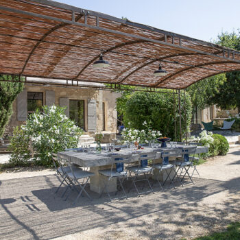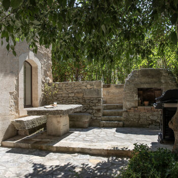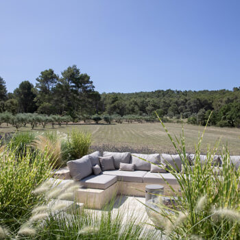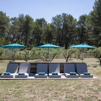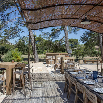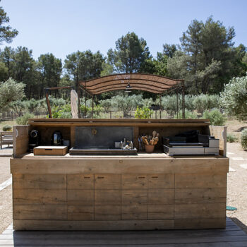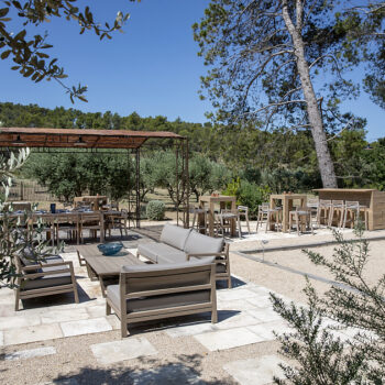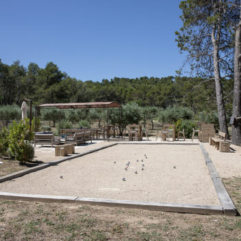 – Espace pétanque avec cuisine d’extérieur, salon de jardin et tables dinatoires au milieu des oliviers