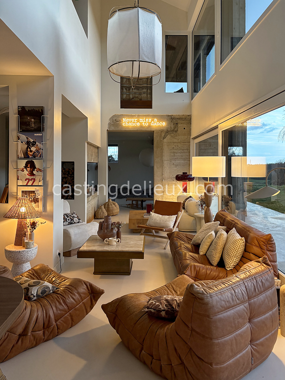 pierre, sol béton, baie vitrée, cheminée, hauteur sous plafond, carrelage/tomettes, parquet, murs peints / tapisseries
