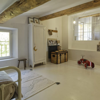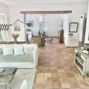 sol béton, baie vitrée, verrière / patio, cheminée, carrelage/tomettes, parquet, murs peints / tapisseries