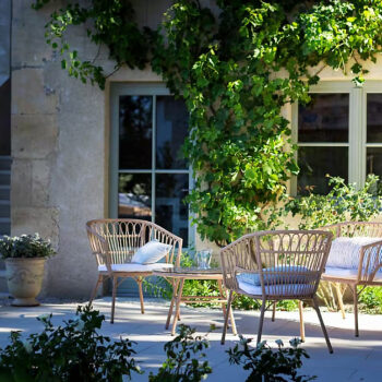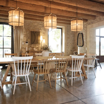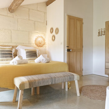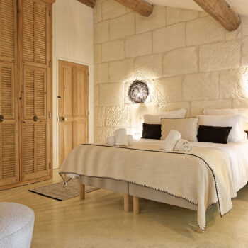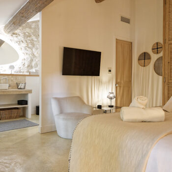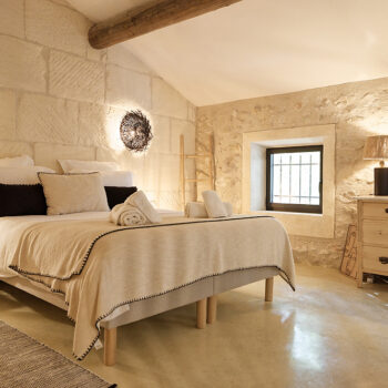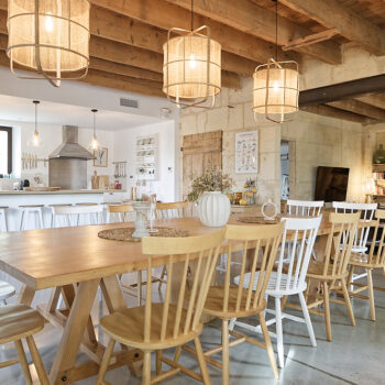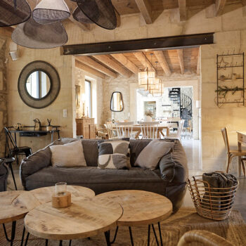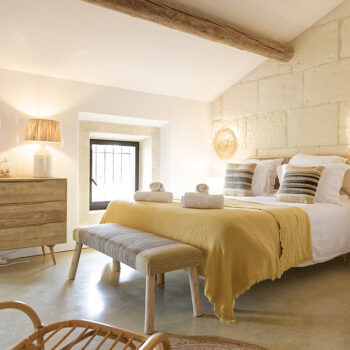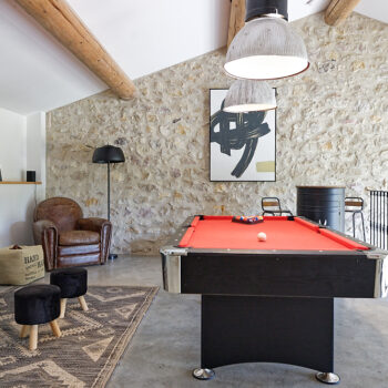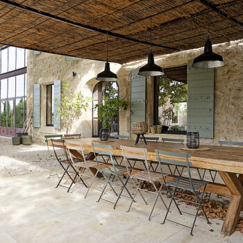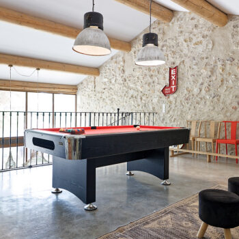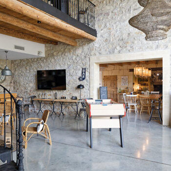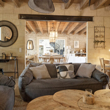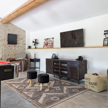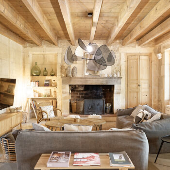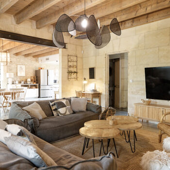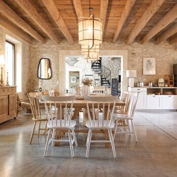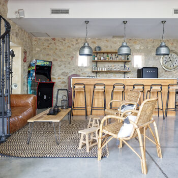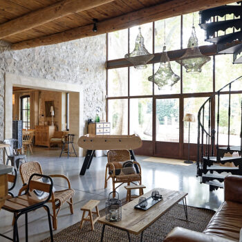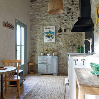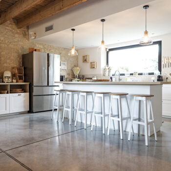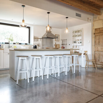 pierre, sol béton, baie vitrée, cuisine ouverte, verrière / patio, cheminée, hauteur sous plafond, carrelage/tomettes