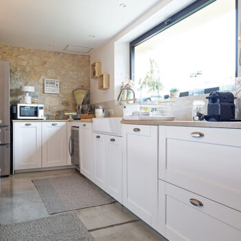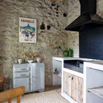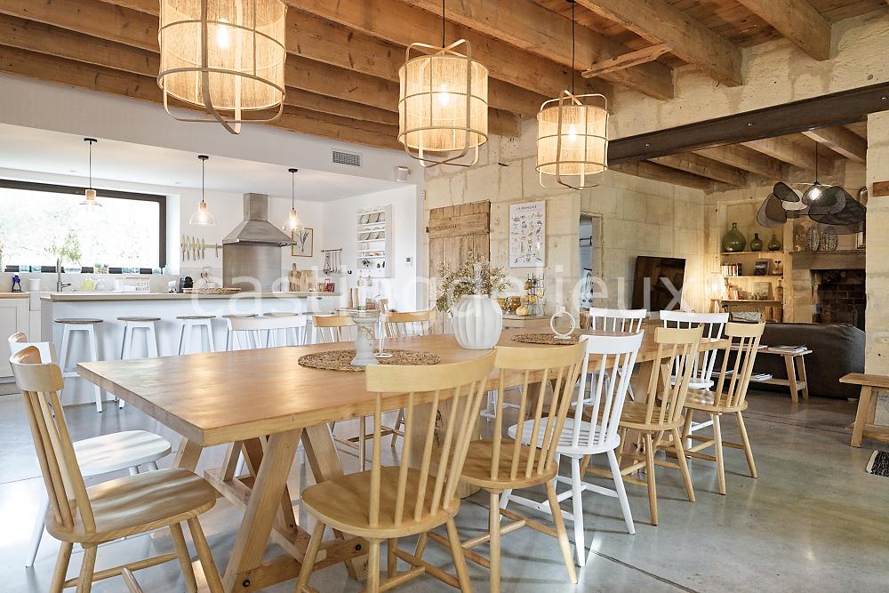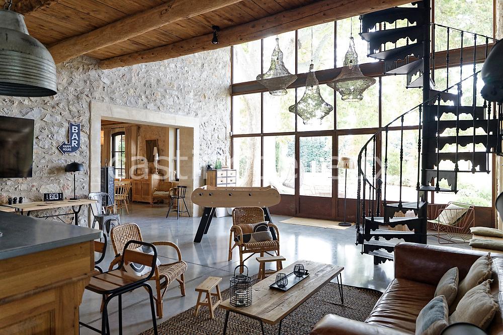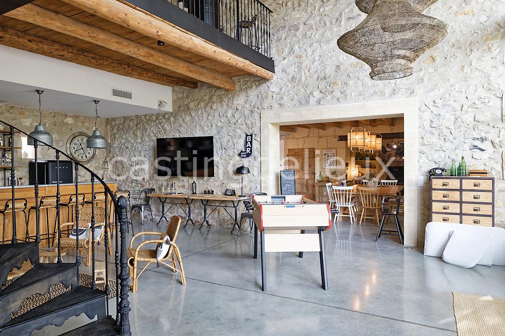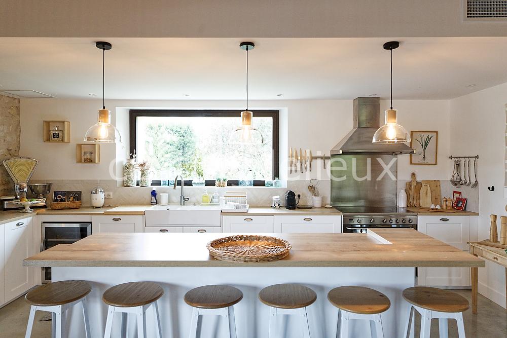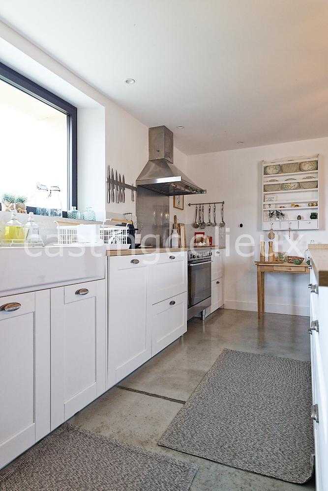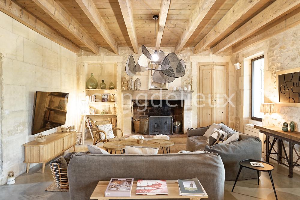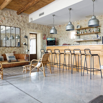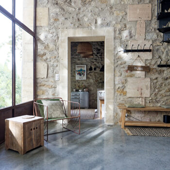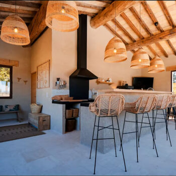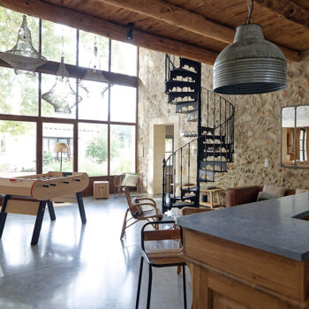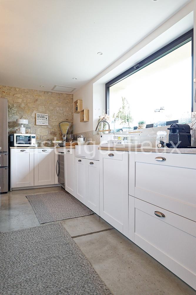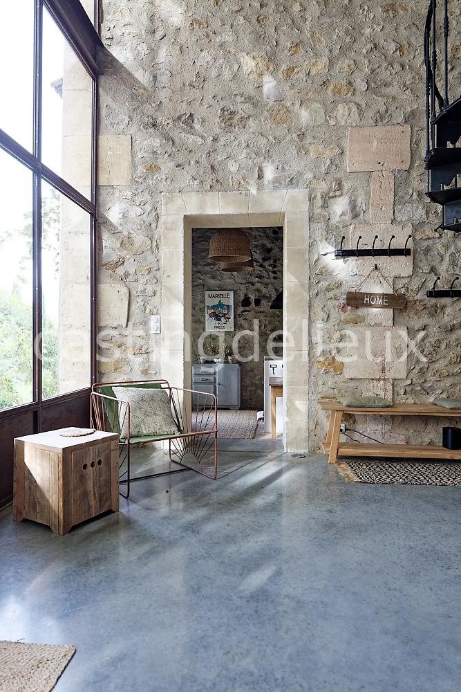 pierre, sol béton, baie vitrée, cuisine ouverte, verrière / patio, cheminée, hauteur sous plafond, carrelage/tomettes