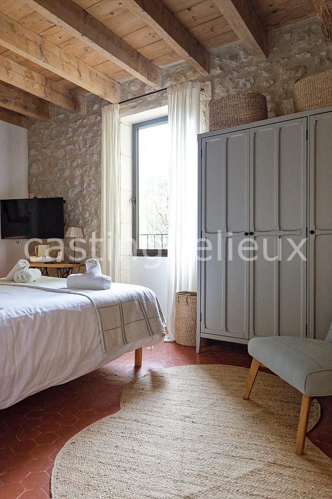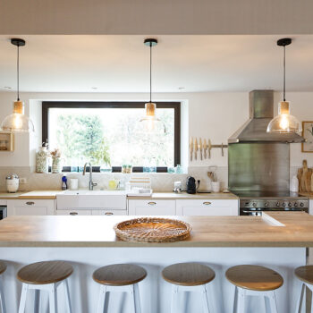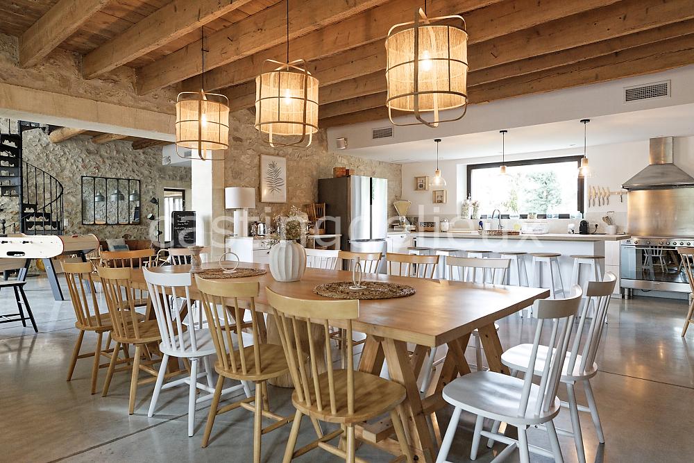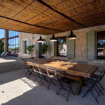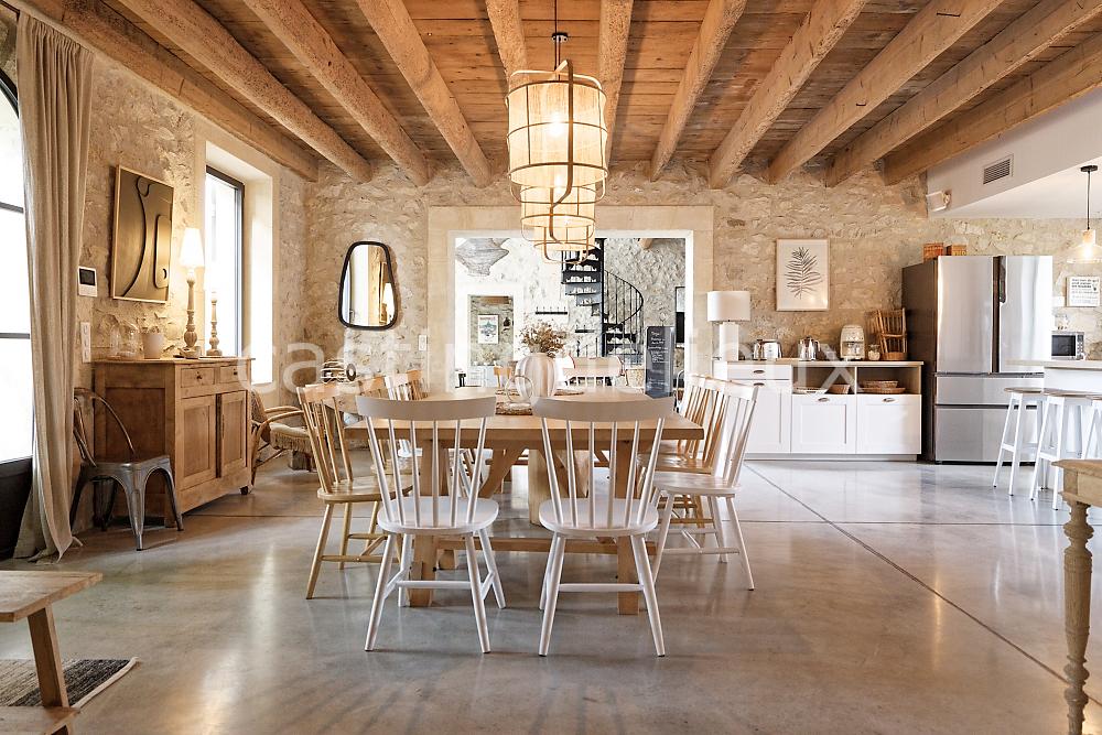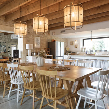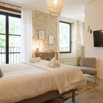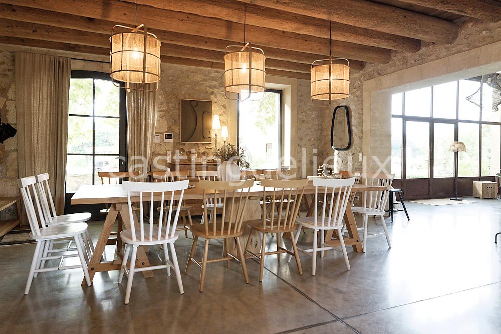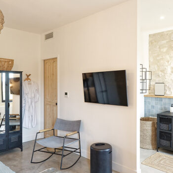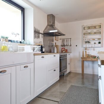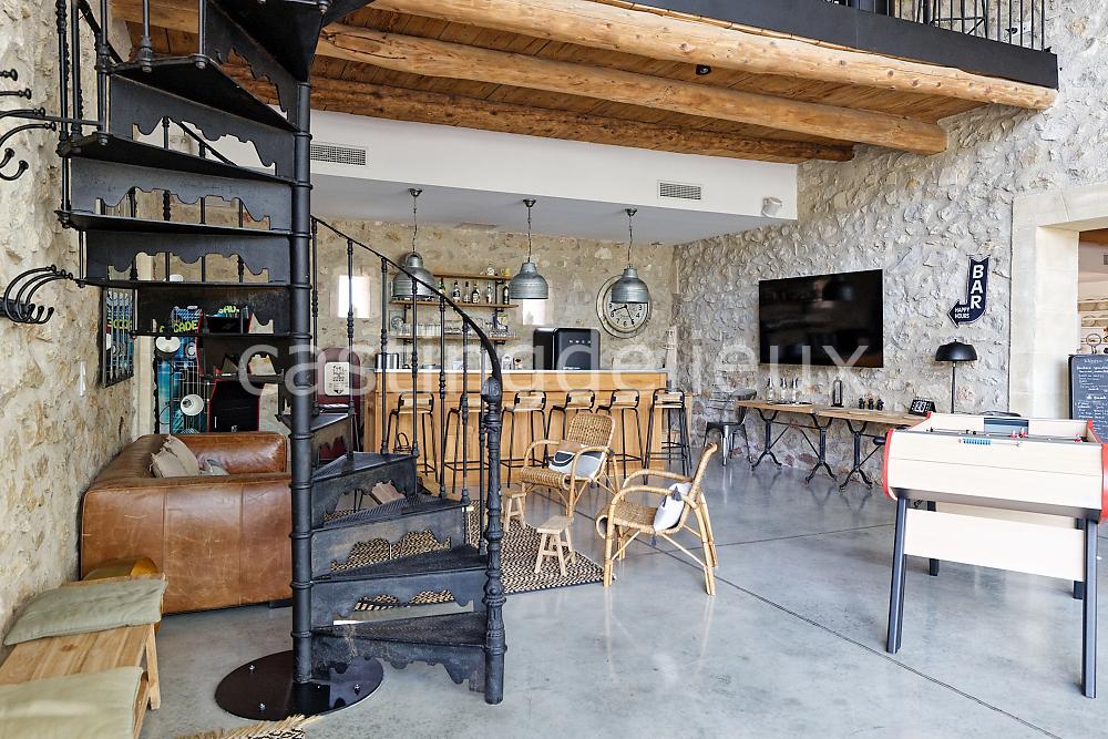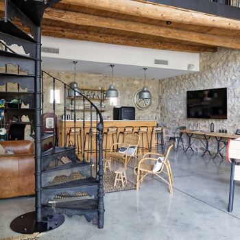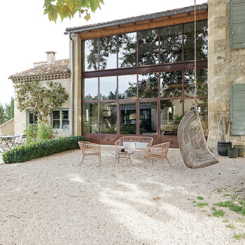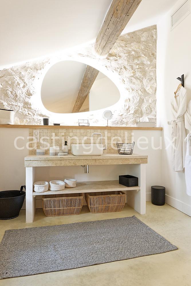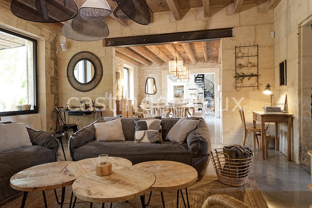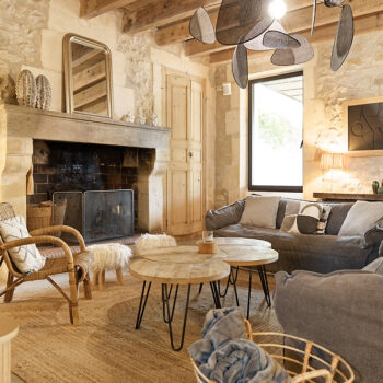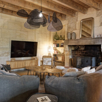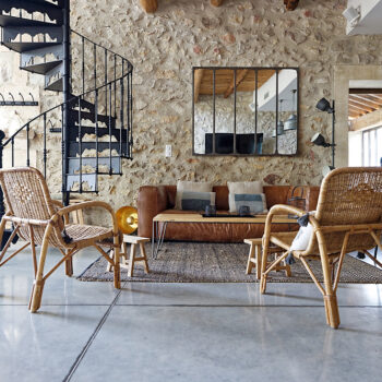 pierre, sol béton, baie vitrée, cuisine ouverte, verrière / patio, cheminée, hauteur sous plafond, carrelage/tomettes