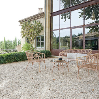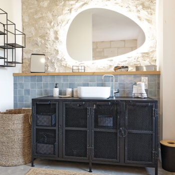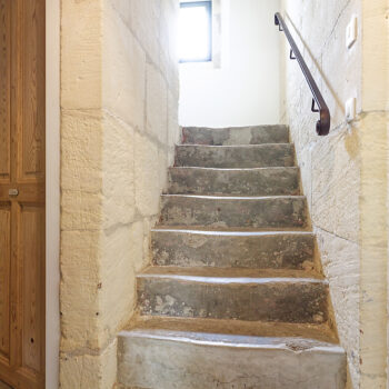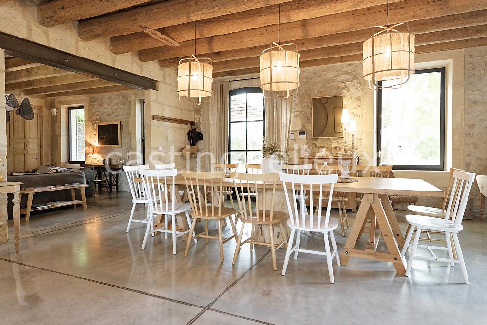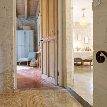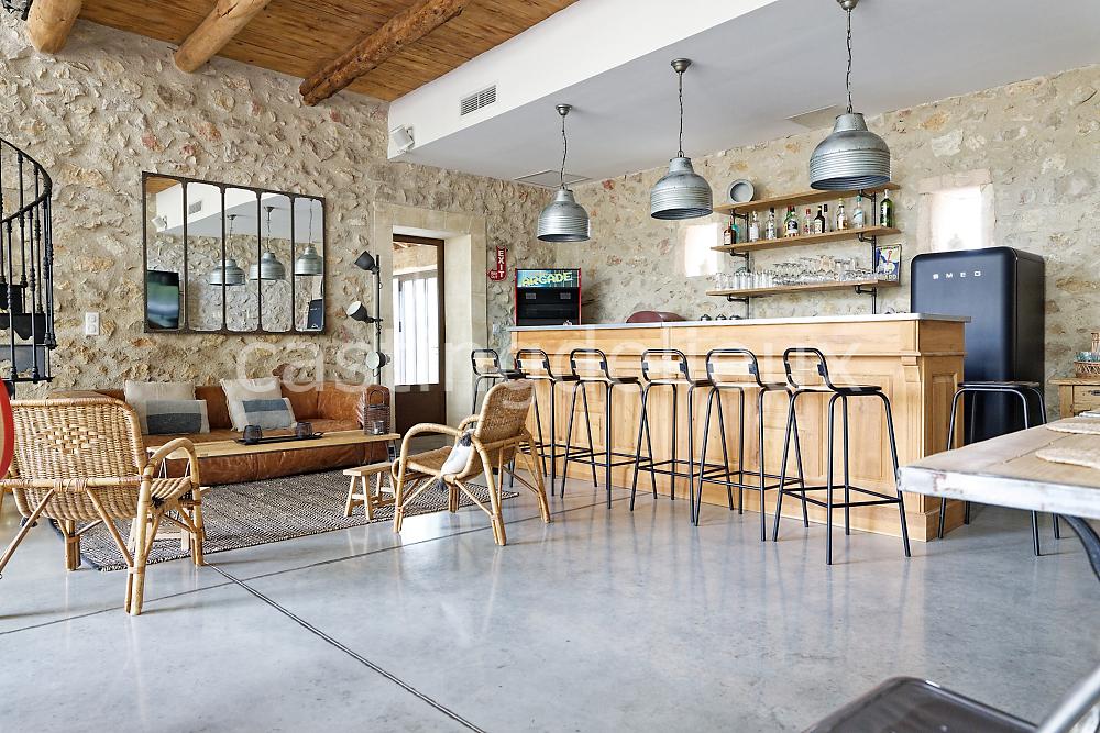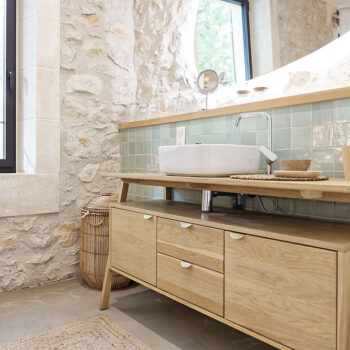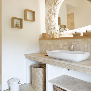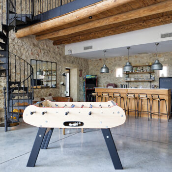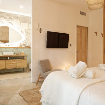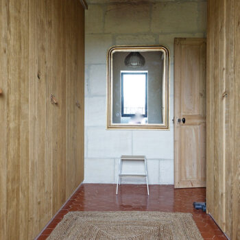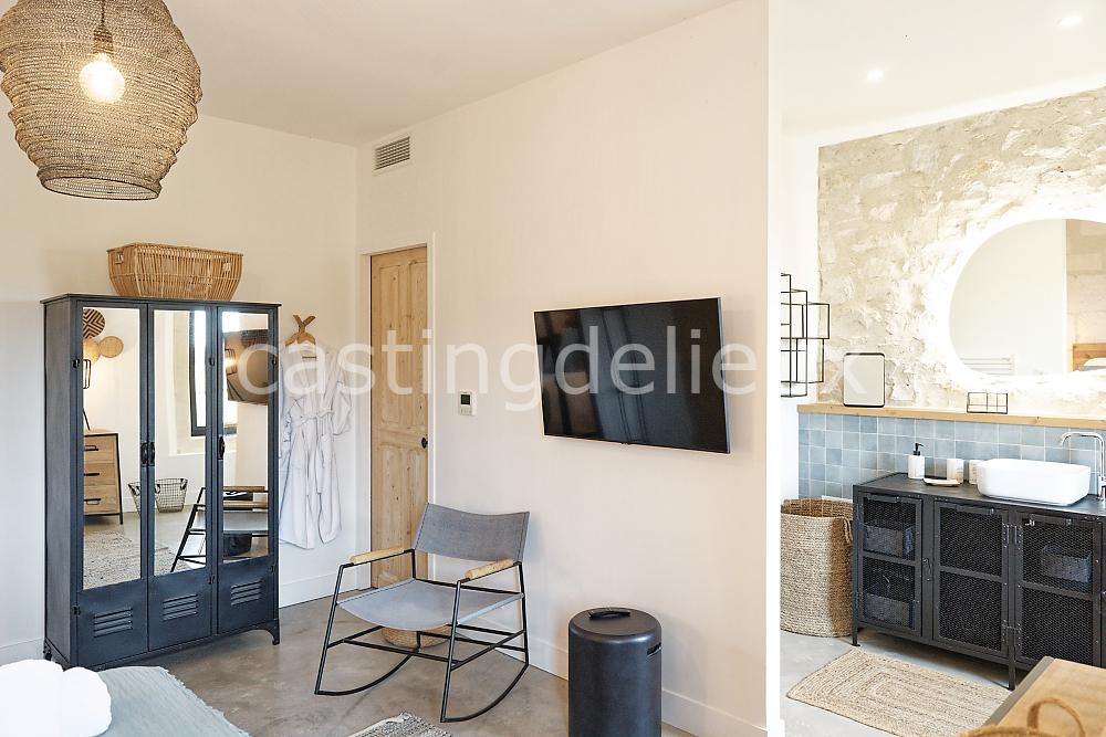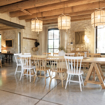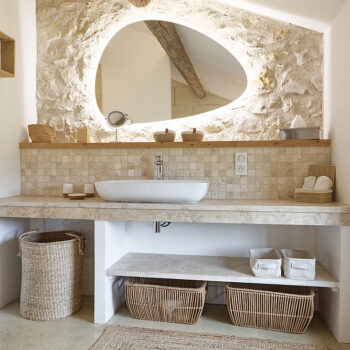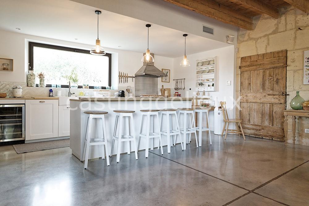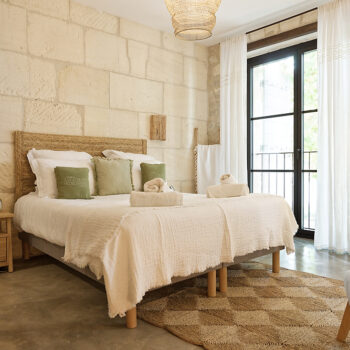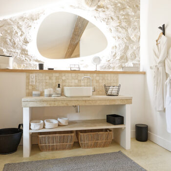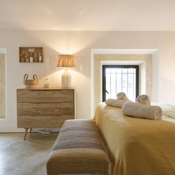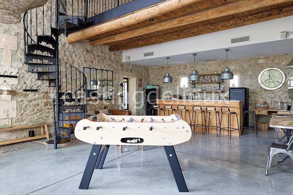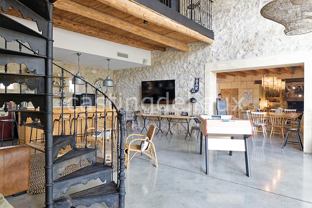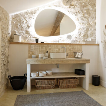 pierre, sol béton, baie vitrée, cuisine ouverte, verrière / patio, cheminée, hauteur sous plafond, carrelage/tomettes