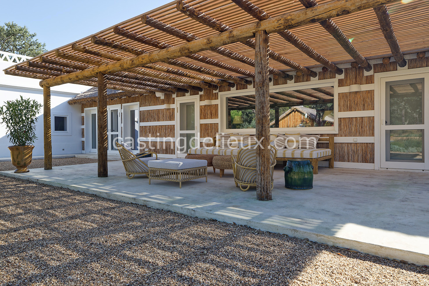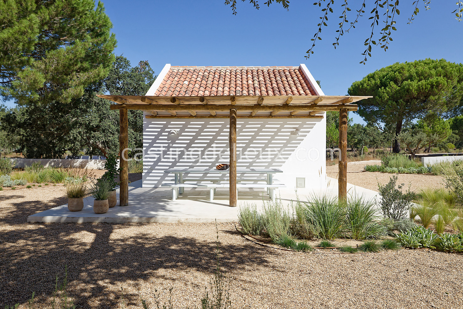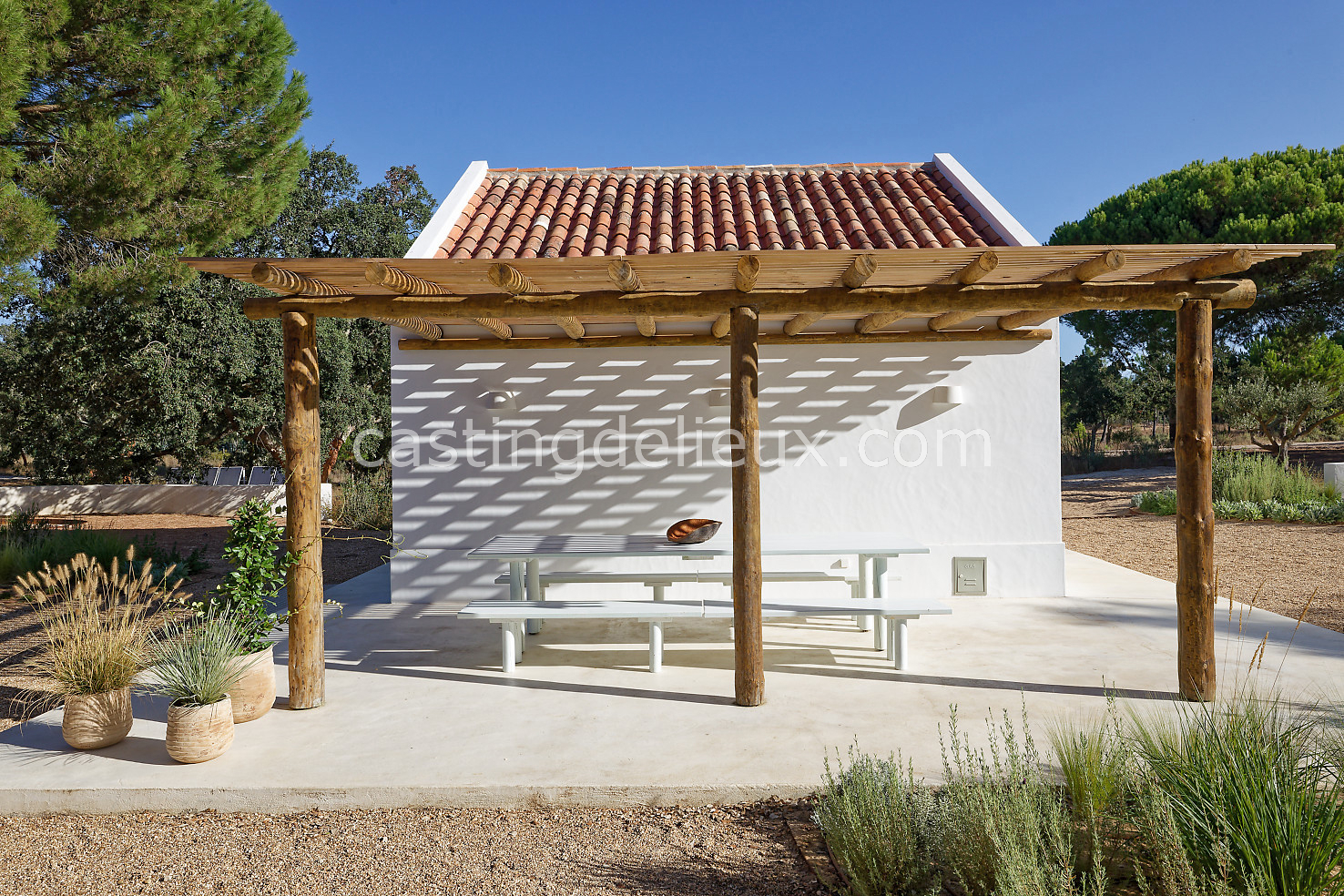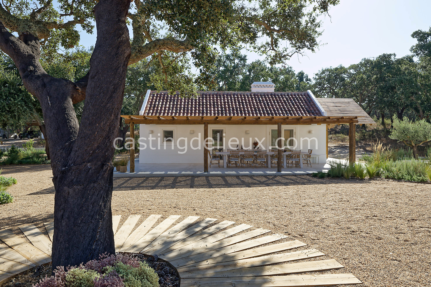 Cette maison de vacances à Comporta offre un décor lumineux et naturel, parfait pour shootings photo, tournages ou projets visuels. Les espaces intérieurs, aux murs blancs et finitions épurées, sont baignés de lumière et structurés autour d’une cheminée chaleureuse, créant une ambiance simple et élégante. L’extérieur séduit par sa terrasse en bois, un grand jardin verdoyant et une piscine traditionnelle entourée de pins, de chênes liège et de nature sauvage, typique de Comporta. La forêt attenante apporte une toile de fond naturelle et versatile pour toutes vos prises de vue. L’ensemble dégage une atmosphère sereine, ouverte sur l’extérieur, qui met en valeur la lumière naturelle et les éléments paysagers. Accessible avec stationnement, ce lieu allie confort, lumière et esthétisme pour vos projets créatifs.