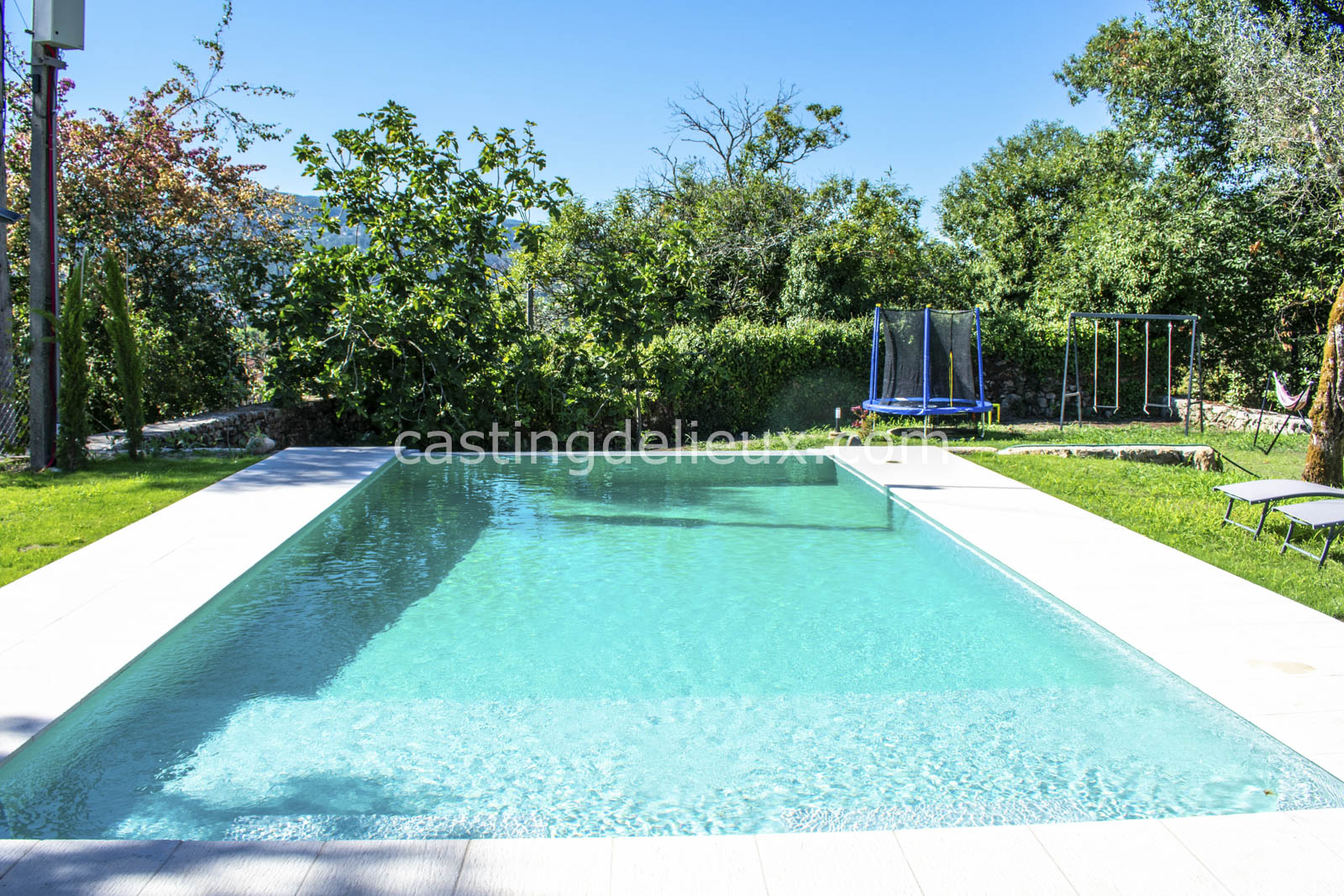 | Environnement extérieur | Grange, Mur de pierre, Piscine à débordement, En campagne, Terrasse carrelée / pierre |