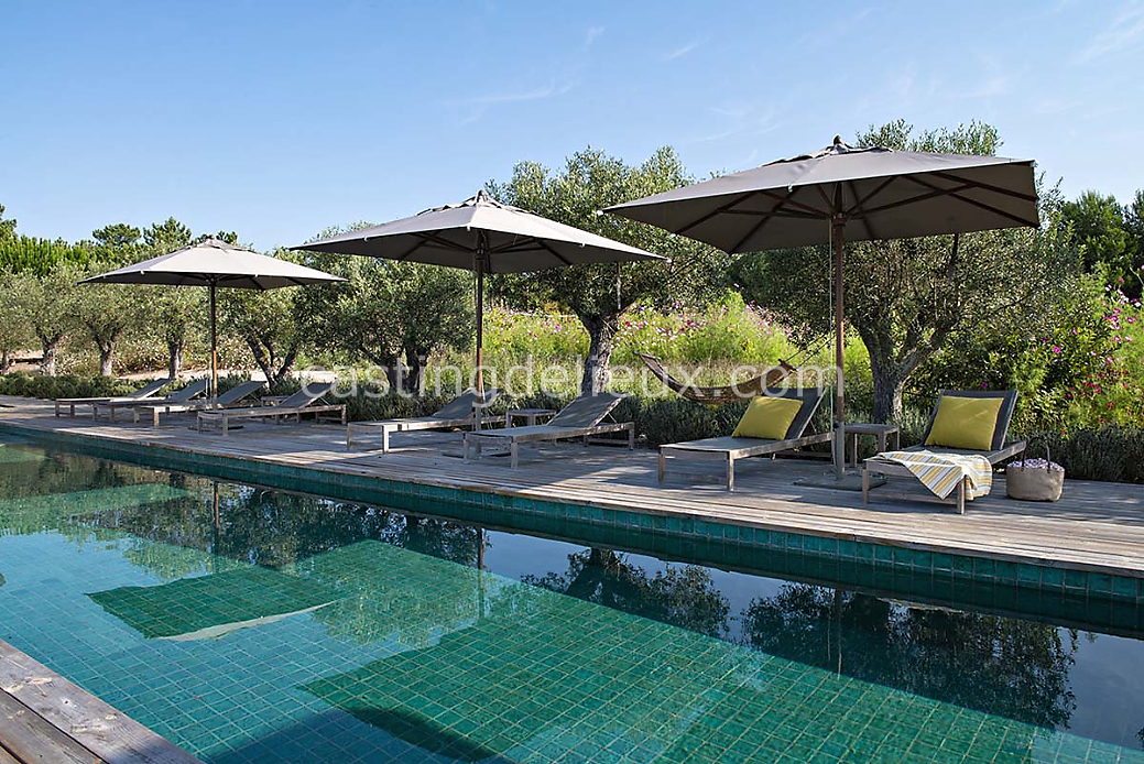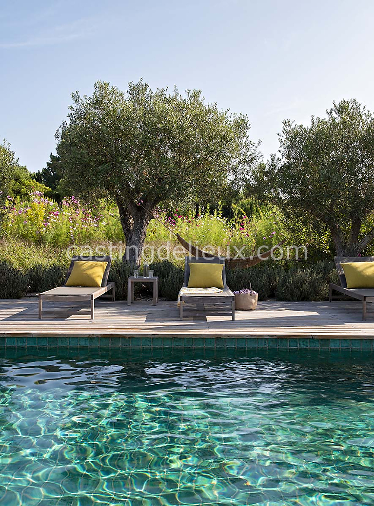 Pool house / Cuisine d’été, Piscine traditionnelle, Végétation luxuriante, Terrasse bois