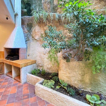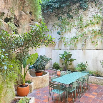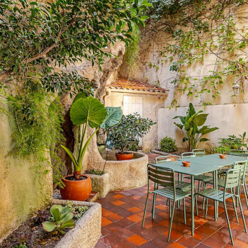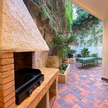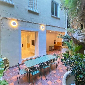 Patio/jardin troglodyte classé au patrimoine, accessible par le salon et terrasse avec vue mer.